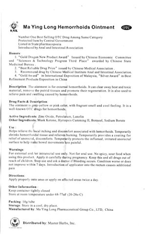 -. Feature : REALLY FAST RESULTS - Ma Ying Long hemorrhoid cream will help you get rid of hemorrhoids or piles fast - results are almost immediate after use! / YOU GET OUR HEMORRHOID RELIEF SYSTEM FOR FREE - With every order or our hemorrhoid cream you will get for free 3 great ebooks to help you heal your hemorrhoids or piles faster. / 120 DAYS MONEY BACK GUARANTEE - The Ma Ying Long Hemorrhoid Cream helps relieve itching, burning, pain or discomfort caused by hemorrhoids and because it already helped thousands of our clients, we offer 120 days money back guarantee! / EASY TO USE & VERY COST EFFICIENT - This ointment is the most affordable Hemorrhoids Treatment and with our hemorrhoids relief system, you'll easily be hemorrhoids free in a few weeks. You will save lots of money by not having to go to the doctor. / NATURAL & SAFE - Our hemorrhoid ointment is 100% natural and a life saver for hemorrhoids. It works by shrinking the distended veins in and around the anal cavity. Try It Risk Free!