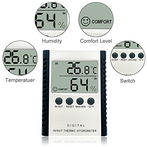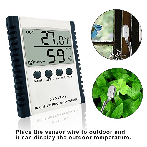 Description : ★ The display records the High/Low of both indoor humidity temperature. Resetting is simple. ★ Desk-top placing or wall hanging ★ IN and OUT temperature measuring