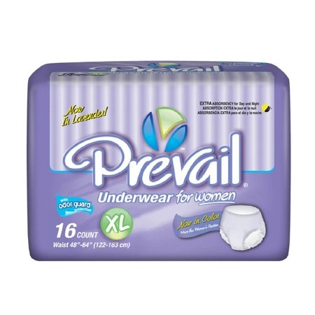 Studio : Prevail Publisher : Prevail Binding : Health and Beauty Product Description Prevail features the the Dri-Fit system which promotes skin health and helps reduce skin discomfort through a unique combination of cotton-enhanced* and synthetic fibers, which help keep you 5X drier than other leading brands.** Designed for maximum leakage protection, Prevail Underwear features Comfort-Shape Plus with gentle elastics that shape to your body for a more comfortable and discreet fit than standard adult diapers with the look and feel of everyday underwear. The cloth-like outer cover is soft and comfortable for all-day wear while ventilated waist panels allow air to pass through, reducing heat buildup and promoting healthy skin. Prevail Underwear is the #1 rated brand in the healthcare industry. Each product is constructed with a discreet core technology that allows for thinner, highly-absorbent material that enables the user to move more freely and confidently. Combined with a super absorbent polymer for dual protection, Odor Guard technology?is proven to reduce the total amount of odor-causing ammonia formed during and after use.?Moisture is quickly locked in upon contact for added leakage protection while the soft outer fabric provides additional all-day comfort. Extra Large size fits waist sizes 48 to 64 inches for a snug and comfortable fit. Each Prevail incontinence product features a proprietary Quick Wick layer of material with MaxSoft Technology that provides advanced softness with rapid liquid absorption for optimal product performance. This package includes four packs of underwear with 16 pairs per package for a total of 64 individual pairs of disposable underwear. Prevail adult care products are manufactured in Pennsylvania with attention to quality, safety, sustainability, and responsible sourcing practices by First Quality, a family-owned company. First Quality is a leader in developing premium quality products. In addition to our collection of adult care products, we also offer lines of baby products, feminine care, paper products, and bottled water.Seal of Cotton and cotton enhanced TM are trademarks of Cotton Incorporated. The topsheet of this product contains minimum 15% cotton. **Based on rewet testing of the leading protective underwear brands. 0