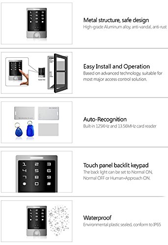 -. Feature : Aluminum alloy structure, waterproof, fully potted, Vandal Resistant confirms to IP65. Touch panel / Built-in 125KHz reader, Anti tamper, antistatic 15KV, Door bell function / The back light can be set to Normal ON, Normal OFF or Automatic mode / Multi-function, operating as slave reader, single door, anti-pass back, etc, suitable for various occasions / Users: 2,000 users, , power supply not included