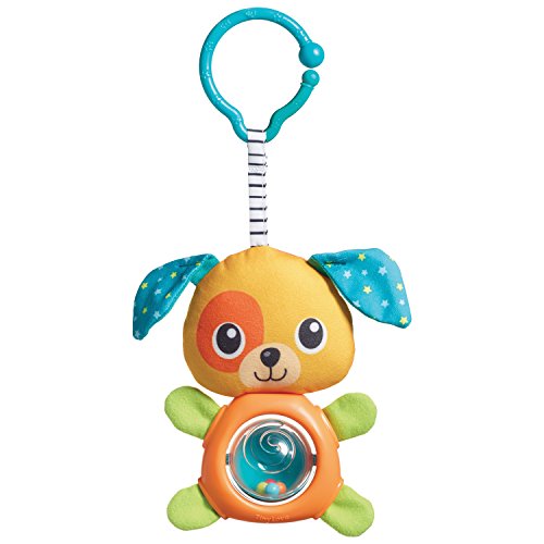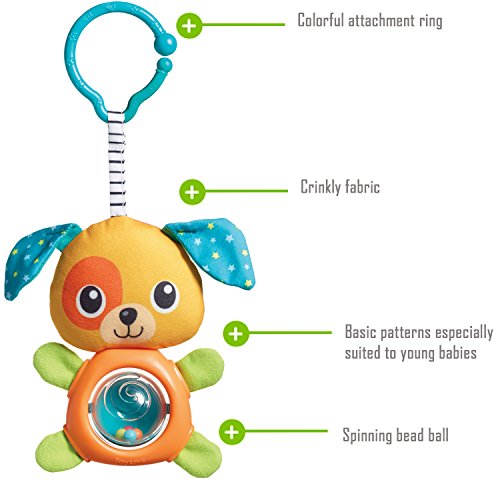 Cute light-weight, colorful toy that is perfect as a take-along crinkly fabric and spinning belly ball with rattling beads engage and stimulate baby adorable all-smiles puppy figure designed with basic patterns especially suitable for young babies unique features stimulate tactile senses and develop fine motor skills.Feature