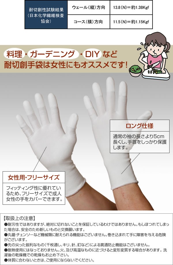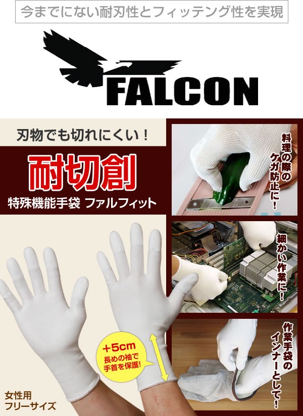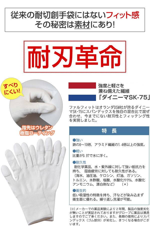 | 料理・ガーデニング・DIY時のケガ防止に!ファルフィットはオランダDSM社のダイニーマSK-75という素材を使い、今までにない耐刃性とフィッティング性を実現。指先はウレタン樹脂コーティングですべりにくくなっています。 |