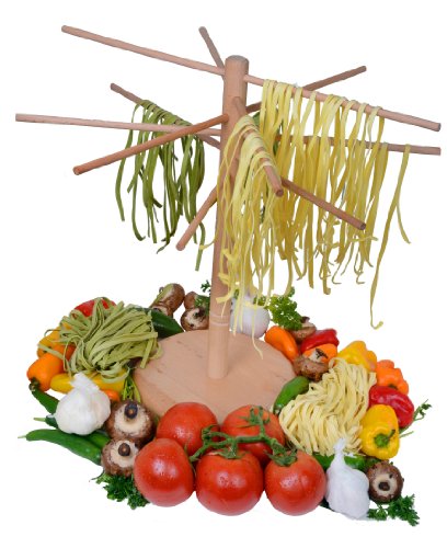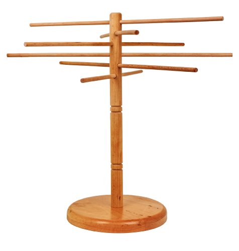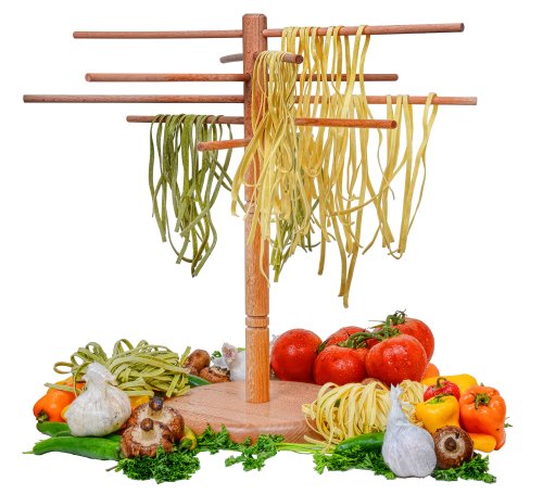 Now, before you run to your clothing closet and fetch the nearest plastic hanger, allow us to introduce the better pasta hanging apparatus: the beautiful pasta drying rack from DB Tech. Made from natural, traditionally unfinished wood, our rack features six 18-inchlong wooden dowels. Combine that with its 17-inch height profile, and this one rack gives you a total of nine feet of drying space. Unfinished wood also means no chemical paints or lacquers coming in contact with your food, and conveniently non-sliding hanging surfaces.