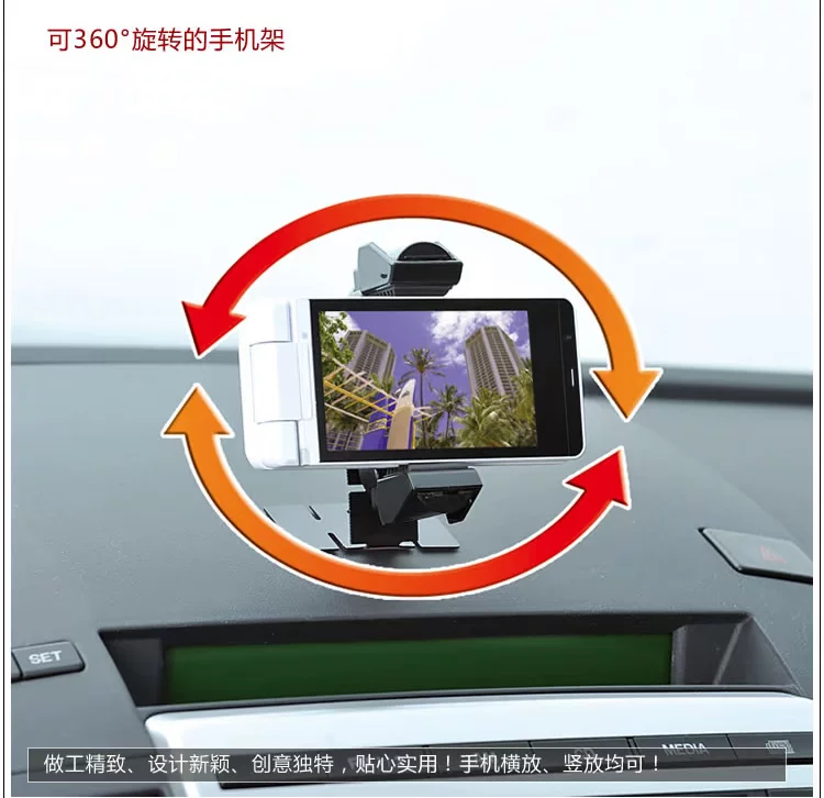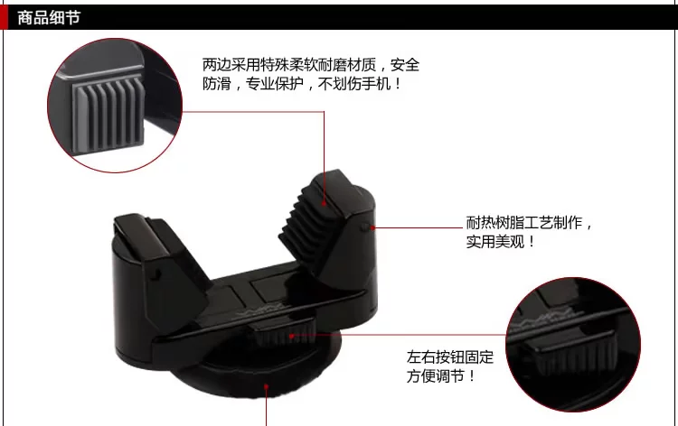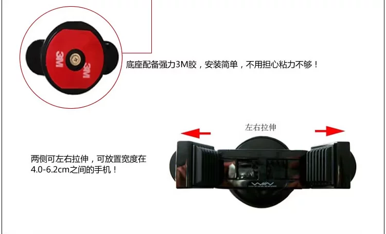 1, retractable design, opened on both sides can put the phone (candy bar or clamshell available), especially for iphone and other smart phones; 2, two-fixed, 360 ° rotation, so that side of the phone jack can be exposed to the outside, does not affect the use of cell phone charger; 3, the product comes with 3M adhesive glue can be used on both sides fixed to the vehicle, install, easy to use, five seconds to complete; 4, the product on both sides of wear-resistant material with a special soft, non-slip safety, professional protection, do not scratch the phone; 5, the broad scope of application; This phone holder is suitable for driving recorder, cell phone, MP3, MP4, MP5, GPS navigation, iphone and many other electronic products;