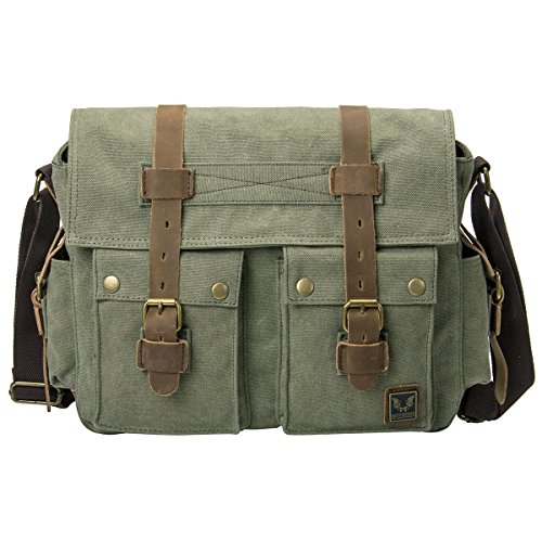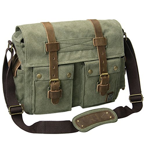 -. Brand : peacechaos -. Color : Army Green -. EAN : 0705701323914 -. Feature : Canvas/ Leather / STRONG AND DURABLE; thick high density canvas and real cow leather will last years of unquestionable reliability / SECURE DESIGN; with magnetic fasteners outside and zippers closure inside, maximum security for valuables is guaranteed / VERSATILE; designed for a variety of practical, casual uses by men, women, boys and girls. Can be used to carry a up-to-14.7 inch laptop conveniently / UNIQUELY STYLISH; though retro-styled, the design perfectly gels with any modern look -. Model : 5602550 -. MPN : 5602550 -. PartNumber : 5602550 -. ProductGroup : Apparel -. ProductTypeName : LAGE -. Title : Peacechaosmen Leather Canvas Shoulder Bookbag Laptop Bag (Army Green) -. UPC : 705701323914