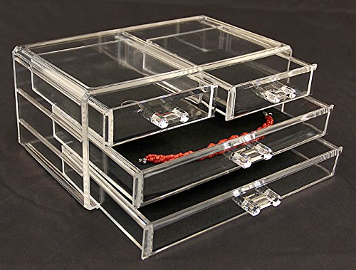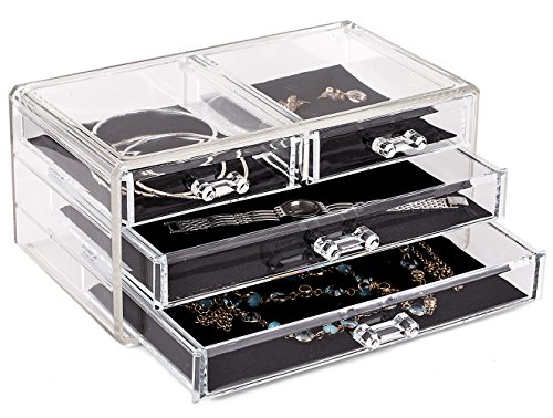 -. Binding : Kitchen -. Brand : Estilo -. Color : Value Not Found -. EAN : 0784672956666 -. Feature : The Estilo acrylic jewelry box organizes all jewelry and cosmetics in one place / The only organizer which is made by 100% pure acrylic material. more durable, NO yellowing and NO scratches. Unlike others who write acrylic but sell PS material / Removable black fleece padding keeps jewelry protected and in place. Completely removable drawers slide out smoothly / Stylish and functional design that will look great in any bedroom or bathroom / Dimensions: 9 3/8 x 5 3/8 x 4 3/8 H inches. Small compartment: 3 13/16" x 4 7/8" x 1 3/16"H. Big compartment: 8 3/8" x 4 7/8" x 1 3/16"H -. IsAutographed : 0 -. Label : Estilo -. Manufacturer : Estilo -. Model : EST0173 -. MPN : EST0173 -. NumberOfItems : 1 -. PackageQuantity : 1 -. PartNumber : EST0173 -. ProductGroup : Home -. ProductTypeName : HOME -. Publisher : Estilo -. Studio : Estilo -. Title : Estilo 100% Pure Acrylic Cosmetic and Jewelry Organizer, Storage Display Box -. UPC : 784672956666