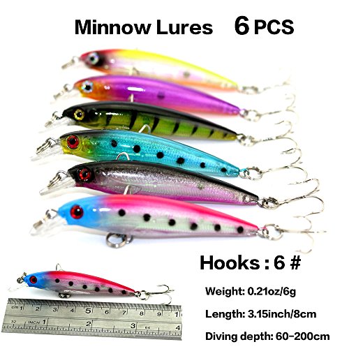 -. Feature : 7 different baits:Popper 6pcs,Minnow 6+6+7+6pcs(4 different styles),VIB 6+6pcs(2 different styles). / Hard lures life-like swimming action in the water, more attractive,3D stereoscopic eyes, more realistic and vivid. / All Set are made with premium high quality plastic. This makes the lure soft, flexible with highresolution body detail, life-like swimming actions in water, and a hidden hook / Great for Bass, Perch, Panfish,Perch,Trout,even pike and salmon!This kit is best gift for your friends and families / Colors will be sent by random, but not to impact the quality and quantity