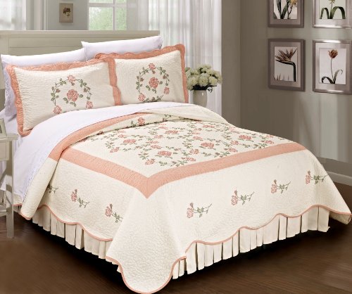 Serenta Classic Flowers 100% Cotton Bedspread Quilt Blanket 3 Piece Bed Set, King, Pink Rose