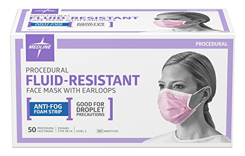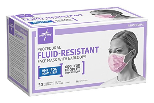 -. Title : Medline NON27712EL Fluid-Resistant Procedure Face Masks with Earloop, Cellulose, Anti Fog, Latex Free, Purple and White (Pack of 300)