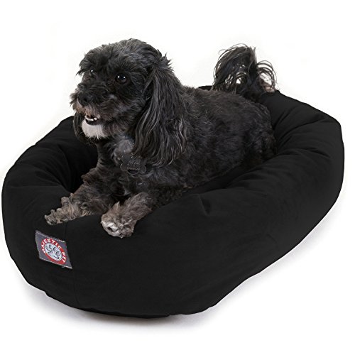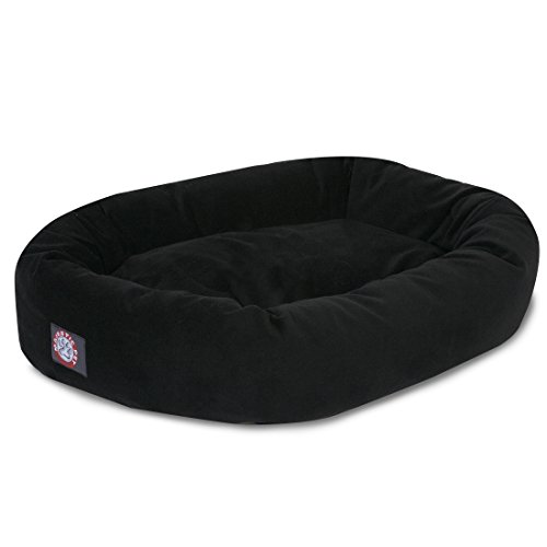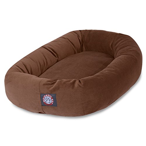 32-inch Stone Bagel Style Pet Dog Bed from Majestic Pet Products (Outside Dimensions 32-inch by 18-inch /Inside Dimensions 24-inch by 18-inch /Bolster 10-inch H/Cushion 7-inch H). The base is a heavy duty water proof 300/600 Denier, the Bolster and Cushion are a durable fau by suede and stuffed with a Super Premium High Loft Polyester Fiber Fil. Machine washable in an oversize washer on gentle cycle; air dry. (Medium recommended for dogs 25 to 45-pound).