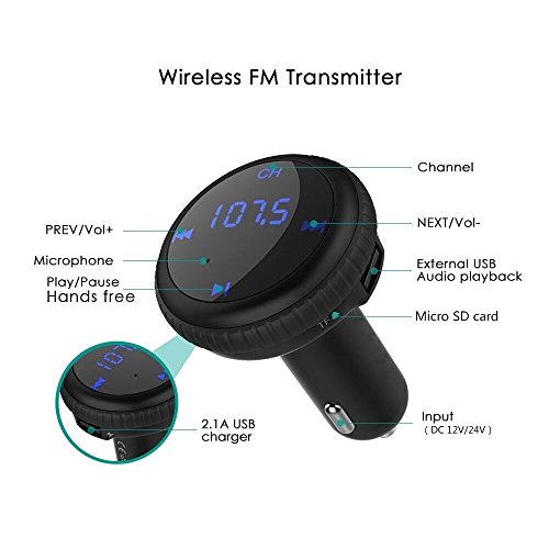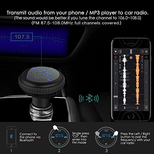 FM Transmitter Radio Adapter: wirelessly stream high quality audio to the car FM stereo system via Bluetooth connection to compatible devices. You can also insert U disk or micro SD card to play the MP3 file. FM 87.5-108.0MHz full channels covered.(The sound would be better if you tune the channel to 106.0~108.0)