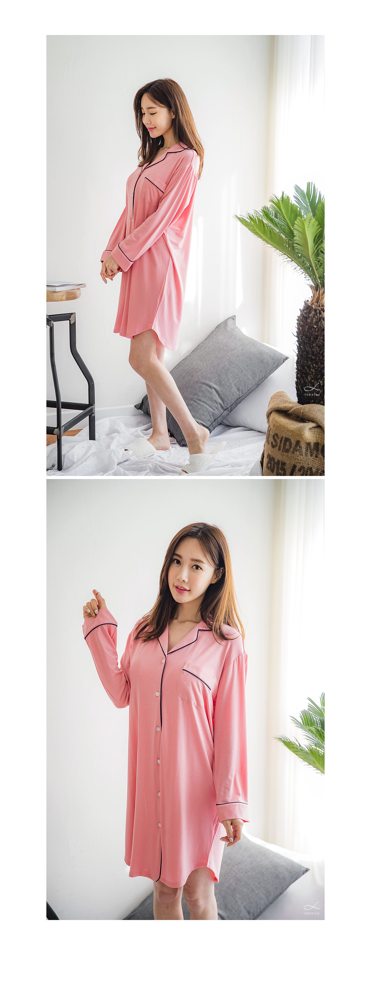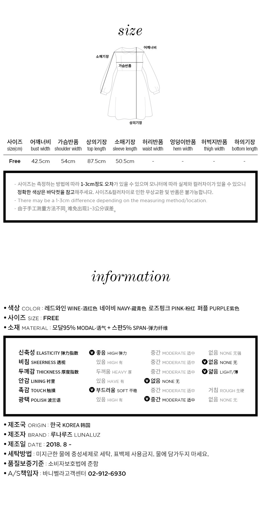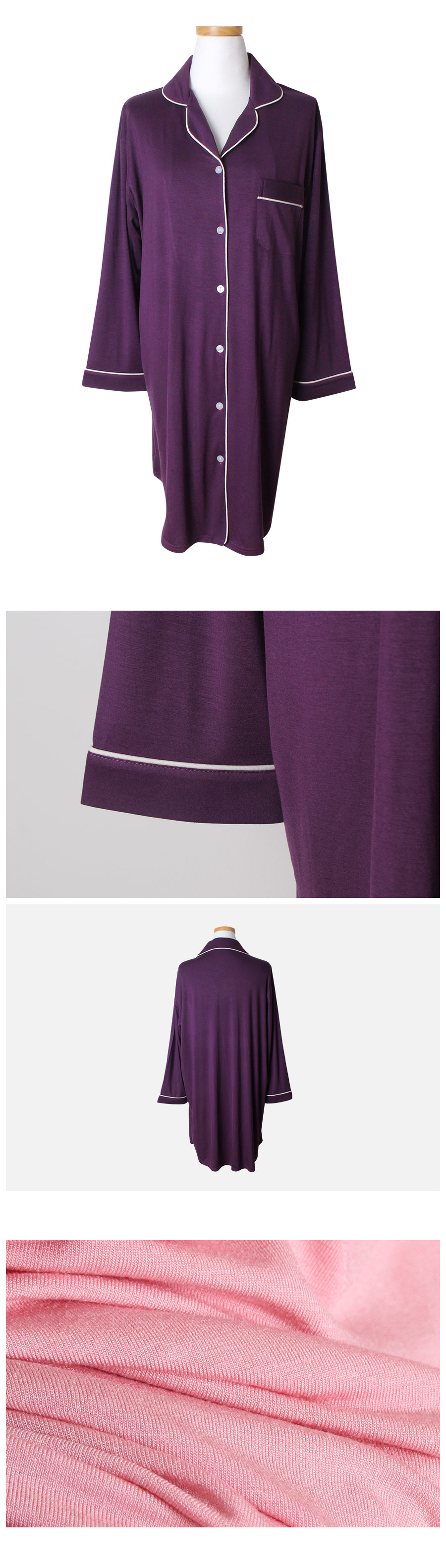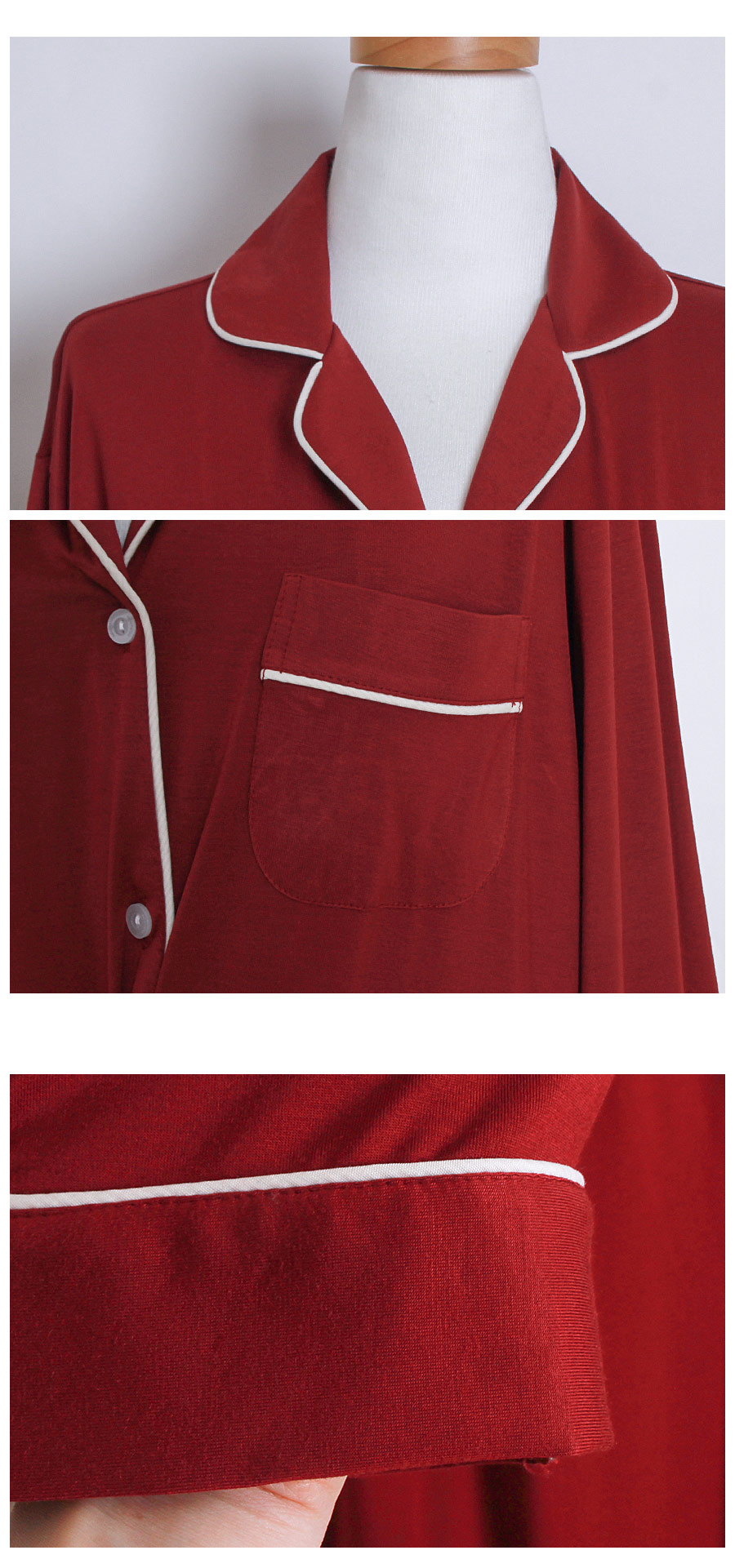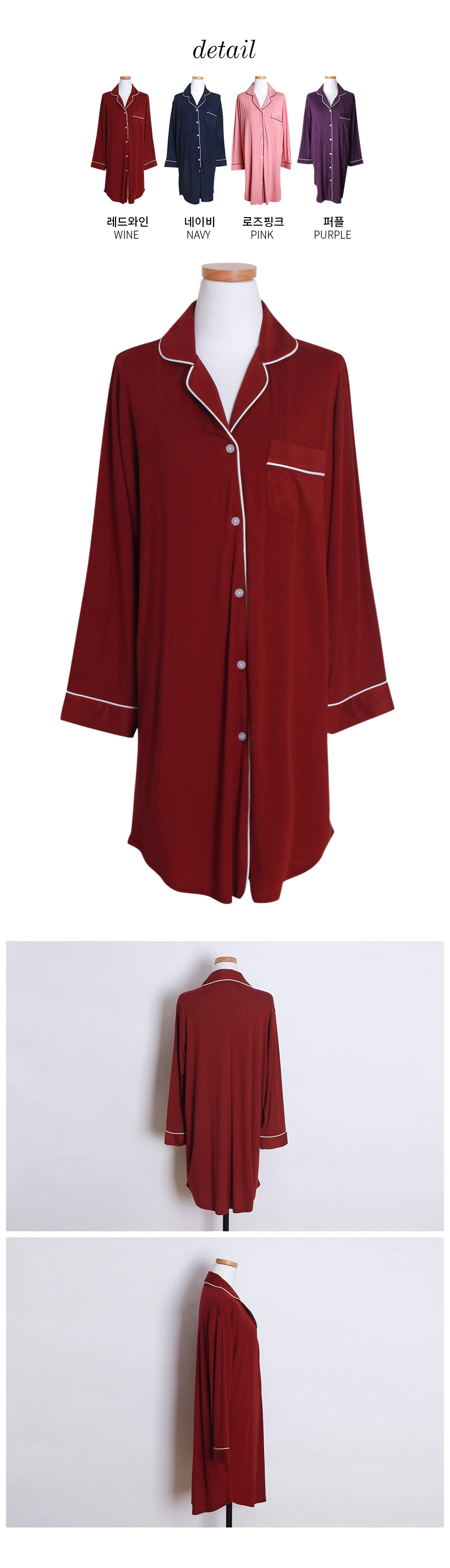 손으로 한 번 쓸어만 봐도 촉촉하고 윤기 있는 터칭감에 반할 수 밖에 없는 프리미엄 모달 잠옷이에요 :) 레드 와인 컬러로 얼굴 빛이 한 층 더 생기 있어 보이도록 연출해줍니다. 반품율 0%, 만족도 100% 인 만큼 고급스러운 소재와 깔끔한 디자인에서 구매율이 정말 높은 잠옷이랍니다. 피부가 민감하신 분들에게 적극 추천해드리고 싶은 파자마 세트입니다. 탄탄하고 쿨한 텍스쳐와 쫀득한 텐션까지 가진 잠옷입니다. 밤나무에서 추출한 천연 섬유로 일반 면소재보다 강하고 우수한 안정성을 가진 패브릭이에요:) 백화점에서 구입하시면 정말 고가의 잠옷입니다. 가정에서 물세탁까지 가능한 소재로 소재의 내구성, 퀄리티에서 꼭!!! 구입하셨음 좋겠어요:) 컬러는 세련된 레드와인, 깔끔한 네이비, 여성스러운 무드의 로즈핑크, 매력적인 퍼플 총 4가지로 제작했습니다. 모든 색감이 예뻐 어떤 컬러를 선택하셔도 꼭 마음에 드실 거에요.^^ DETAIL 포켓 카라 스타일의 파자마 디자인으로 카라의 끝 부분과 클로징부분 마감과 손목과 팬츠 하단에 파이핑을 둘러 포인트를 주었습니다. 원피스의 하단은 둥글게 제작해 더 스타일리쉬해 보입니다. 소재가 신축성이 굉장히 좋아 파이핑 봉제 작업에서도 까다로운 공정이 들어간 잠옷인데요. 흐늘거리는 소재로 안에 심지를 넣어 작업하여 옷의 태를 예쁘게 살려주었습니다. 몸에 감기면서 편안한 원피스잠옷을 꼭 느껴 보셨음 좋겠어요.^^ 한 번 쟁여 놓으면 게속 해서 손이 갈 잠옷으로 옷걸이에 걸어서 보관하셔도 멋스러움에 반하실 거 랍니다. 소재, 컬러, 디자인까지 세심하게 작업한 잠옷으로 강력 추천합니다. 선물은 물론이고 개인 소장으로도 꼭! 구매하셨음 좋겠어요. 100%국내 제작으로 소재, 디자인, 봉제의 퀄리티가 높습니다. SIZE 44반size~66반size까지 착용 가능한 free사이즈입니다.