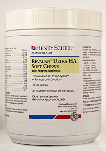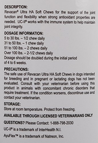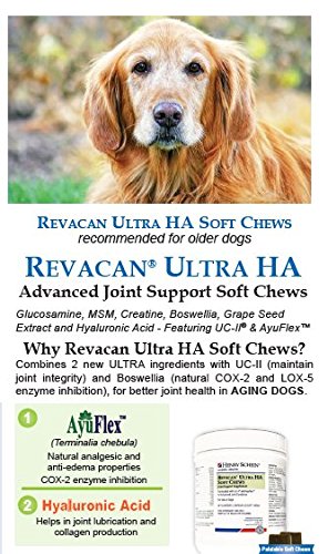 Revacan Ultra A Soft Chews have a comprehensive formulation with ingredients supporting joint health: UCII, supports the immune system, AyuFlex is an organic ingredient that supports collagen production and Hyaluronic acid which aids in joint lubrication. Combines 2 new ULTRA ingredients with UC-II (maintain joint integrity) and Boswellia (natural COX-2 and LOX-5 enzyme inhibition), for better joint health in AGING DOGS.Feature
