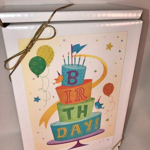 - All packed in a glossy, sturdy gift box (no cheap basket or flimsy cellophane) with the fun message "Birthday!" on front, tied with a gold bow
