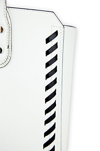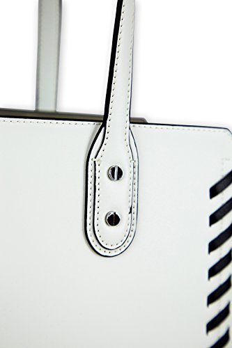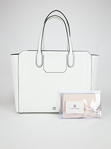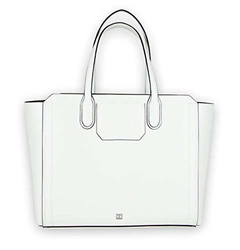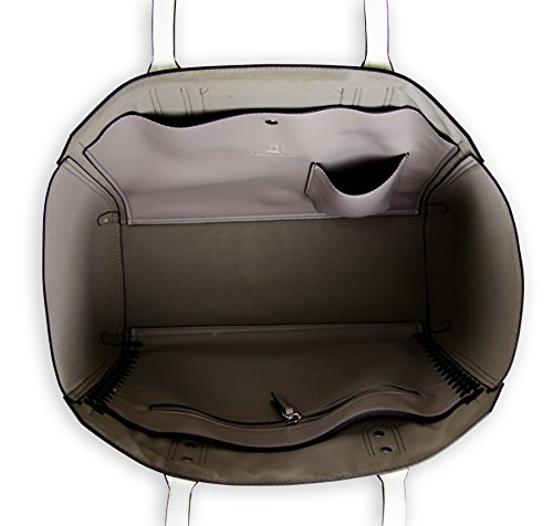 Smooth leather tote in dove with black leather lashing accents. One large, snap-closure pocket with small slide pocket for phone or keys; one large, slip pocket with zip pocket on the panel. Removable, rechargable battery with micro-USB cable for charging phones or devices on the go. Removable, clear zip pouch for make-up or other small items.Feature