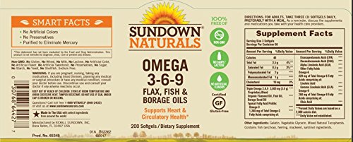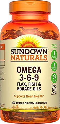 Sundown Naturals Triple Omega 3-6-9 provides you with a blend of Fish, Borage and organic Flax Oils, all of which contain the important polyunsaturated fatty acids your body needs.* Among these important fatty acids are Omega-3s, which are known for their ability to support healthy heart and cardiovascular function.* Omega-3s also contribute to healthy circulation and metabolic health.* Triple Omega 3-6-9 is purified to eliminate heavy metal contaminants such as mercury and supplies 1,354 mg of Omega-3s per softgel.