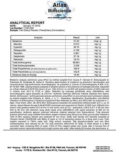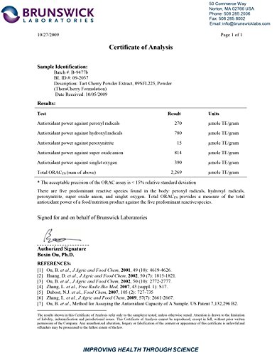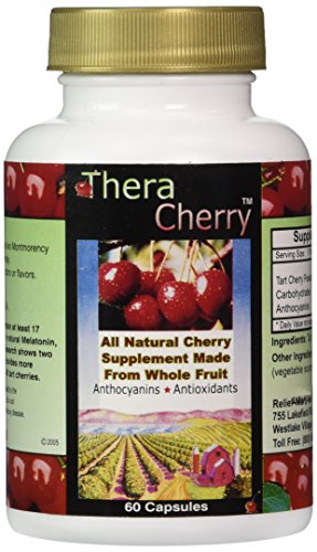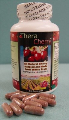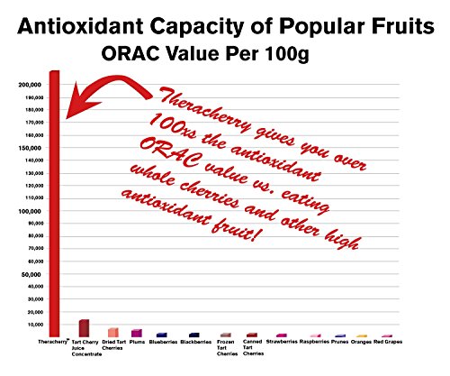 -. Feature : Targets Muscles, Joints, Tendons, Bursa, Ligaments and Nerves For Optimal Support and To Help Increase Flexibility. / Highest Natural Source of Melatonin For Better Sleep and Help Prevent The Daytime Drowsiness Associated With Time Zone Changes. / PROVEN PEER REVIEWED SCIENTIFIC STUDIES Back TheraCherry's Effectiveness (please email us or call us at 800 667-1969 if you would like to read the scientific data). / Tested By Brunswick Laboratory and Shown To Contain Over 100 Xs More ORAC Antioxidant Potency Than Whole Tart Cherries and Blueberries, 16 Xs more than Tart Cherry Juice and 8 Xs More Potent Than Many Tart Cherry Powder Supplements. / 100% Made In The U.S.A. From Montmorency Tart Cherries With High Level Of Anthocyanin Cherry Skins. ONLY TheraCherry's patented formula collects the majority of the very Anti-Oxidant Rich Tart Cherry Skin VS. Other formulations that far less antioxidant rich inside portion of the cherry. Compare to Solgar, Solaray and other Tart Cherry Concentrate Formulations By Looking At Laboratory Results We Display On this Page.