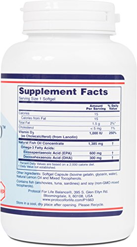 HOW IT WORKS: Fish Oils are naturally abundant in the Omega-3 Fatty Acids (FAs), EPA (Eicosapentaenoic Acid) and DHA (Docosahexaenoic Acid). These FAs are concentrated in eye and brain tissues, where they help to promote proper function of the central nervous system and support eye health.* Omega-3 FAs are also critical for proper immune system function, and help to maintain cardiovascular and joint health.* Ultra Omega 3-DTM is our most potent Omega-3 formula, with 600 mg EPA and 300 mg DHA per softgel. This product is flavored with lemon oil and also provides 1,000 IU Vitamin D3.Protocol For Life Balance® is an A-rated GMP manufacturer of pharmaceutical grade dietary supplements created for healthcare practitioners. Our product line is comprised of effective, science-based formulations intended to address common nutrient deficiencies and support healthy physiological function. These formulations are based on the latest advances in nutritional science and incorporate trademarked ingredients of the highest quality. Our serving sizes are based on doses used in clinical trials and other published data, and the ingredients used in our products have been tested for efficacy in clinical trials and laboratory studies.