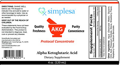 -. Binding : Health and Beauty -. Brand : Simplesa -. EAN : 0661799830546 -. Feature : Part of The Deanna Protocol, AKG Supplement in Liquid. 100 Servings per Bottle. / AKG acid is buffered and non acidic. Best AKG Supplement Available. Alpha ketogluterate Liquid / Easy to Swallow - Perfect for those people taking AKG Supplement frequently / Real AKG, Super AKG, AKG Liquid offers convenience over AKG Capsules. / At Simplesa, you get only the highest quality science-based AKG Supplements in the simplest forms possible. -. Label : Simplesa -. Manufacturer : Simplesa -. Model : SIMAKG -. MPN : SIMAKG -. PackageQuantity : 1 -. PartNumber : SIMAKG -. ProductGroup : Health and Beauty -. ProductTypeName : HEALTH_PERSONAL_CARE -. Publisher : Simplesa -. Studio : Simplesa -. Title : AKG Liquid - AKG Supplement - Alpha ketogluterate - Real AKG - Super AKG 100 Servings -. UPC : 661799830546