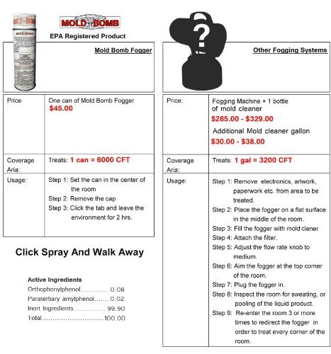 -. Feature : Easy to use mold fogger, Prevent mold from becoming a growing problem. Mold Bomb Kills mold in just one treatment. Our revolutionary one of a kind delivery system will get places you cannot reach with any other product. Mold Bomb works great for mold suppression, prevention, contents, rooms, appliances, eliminates odors, and disinfects surfaces. Don't risk a bigger mold problem when you already have with a less effective cleaner. Go with a product that works, "Mold Bomb"! / Easy step by step directions on how to activate your mold fogger. (1) Place Mold Bomb in the center of the room, or if there is visible mold growth, place the fogger near the site of contamination. (2) Simply remove the cap from the mold fogger and push the tab on the top of the can until it clicks and locks to begin fogging. (3) After releasing the mold fogger, allow to settle for two hours. / Mold Bomb will treat not only the room, but everything inside that room as well. For the best results use in conjunction with Biocide 100.