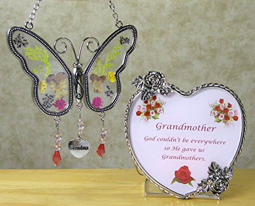 Grandma Butterfly Suncatcher & Candle Holder Gift Set - Metal & Glass - Butterfly Has Real Pressed Flowers in Wings - Hanging Charm with Grandma Engraved - Grandma to Be - Mother-in-law