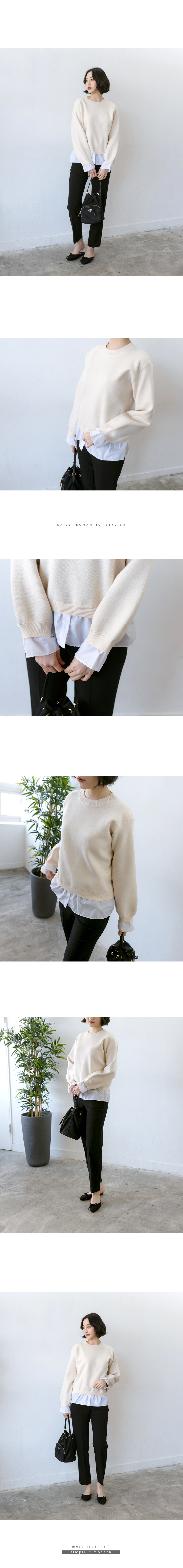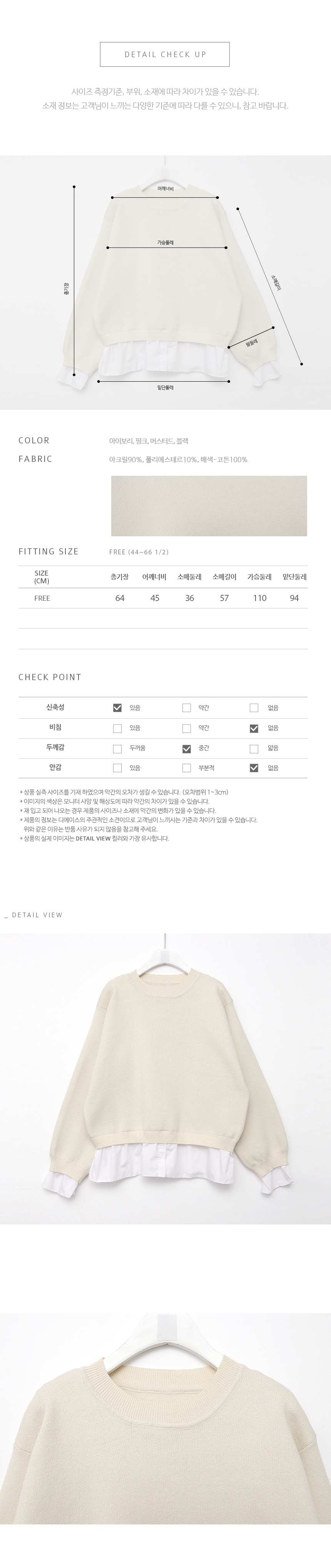 아크릴, 폴리에스테르 혼방으로 쫀쫀하고 부드러운 원사의 짜임이 탄탄한 동글동글한 핏의 니트에 소맷단과 밑단에 코튼 배색을 줘 단정하면서도 여성스러운 아이템이에요.