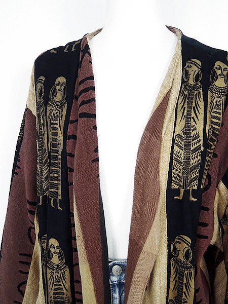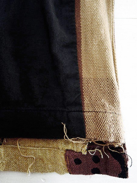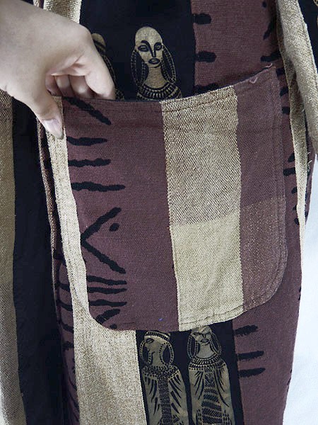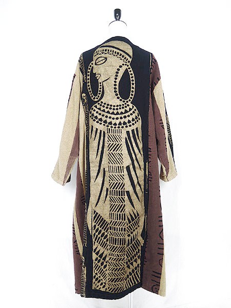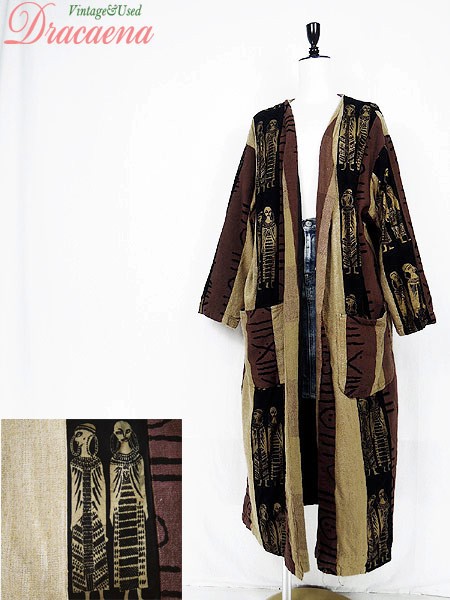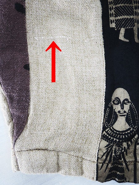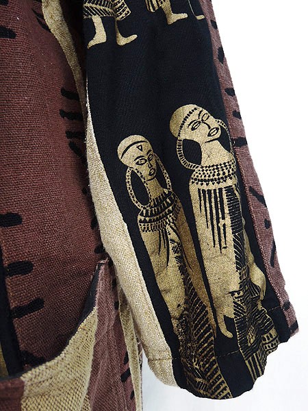 素材の表面全体にネップあり、素材の自然な素朴な味としてご理解いただけましたらと思います。裏地あり。前立て両裾に擦れダメージ、左裾にヨゴレあり。前、両裾プリントに色写りのようなシミあり。右袖に糸引きあり。