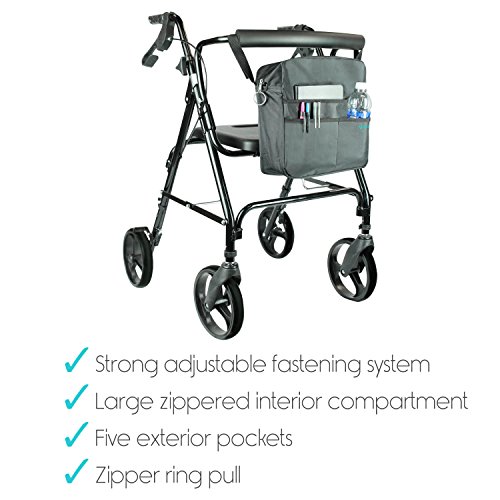 FITS ANY STYLE ROLLATOR, WALKER OR WHEELCHAIR: Quickly and easily secure the durable rollator bag on any style rollator, walker, wheelchair or transport chair with two adjustable Velcro straps. A padded shoulder strap is also included as a convenient alternative for caregivers or loved ones. The large rollator bag measures 12” wide by 12” high by 4.5” deep.