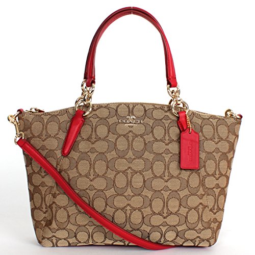 Coach's Small Kelsey satchel is wrapped in Coach's dual tone khaki Outline Signature C print jacquard with classic red leather accents and polished light golden tone hardware. Coach's fabrics are specially treated to repel water. The interior is lined in red sateen fabric and features a zippered pocket and two open multifunction slip pockets. It has a fully zippered top closure and Coach's creed and authenticity patch is sewn inside. Coach's iconic Horse & Carriage logo and removable red leather hangtag accents the front. There are dual leather and golden tone hardware handles with a drop of 5 inches, or you can use the removable longer shoulder and cross-body strap which has a drop of about 21 inches. This beauty measures approximately 10 inches (L) at the bottom tapering to 13 inches (L) at the top x 9 inches (H) x 2.5 inches (W). Made by Coach for distribution via their Coach Factory stores. Coach does not include a dust cover bag.