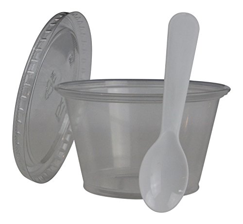 -. Title : Disposable Clear 4oz Plastic Condiment Cups with Lids and 3" Tasting Spoons, Souffle Portion, Jello Shot Cups, Dessert