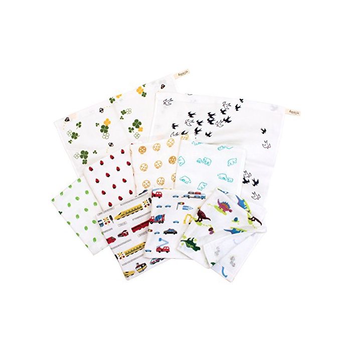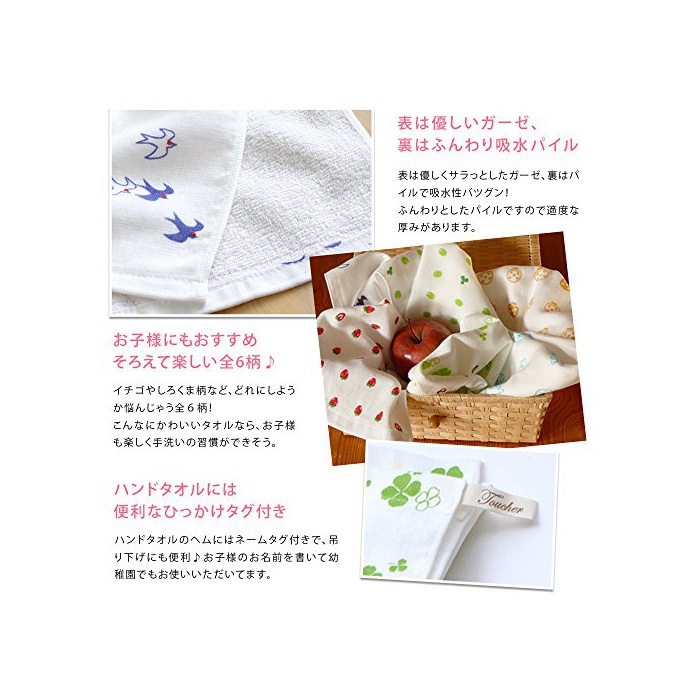 【핸드 타올 9 매세트】생산지:일본(센슈 타올) 소재:면100% 사이즈:약34×34cm 무늬:쁘띠무늬(시로쿠마(백곰),《오마메》,무당벌레,제비,딸기,클로버)고, 사내 아이무늬(전철,싸고, 공룡) 세트 내용:핸드 타올 6매(6병)
