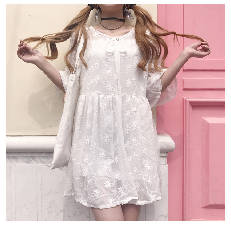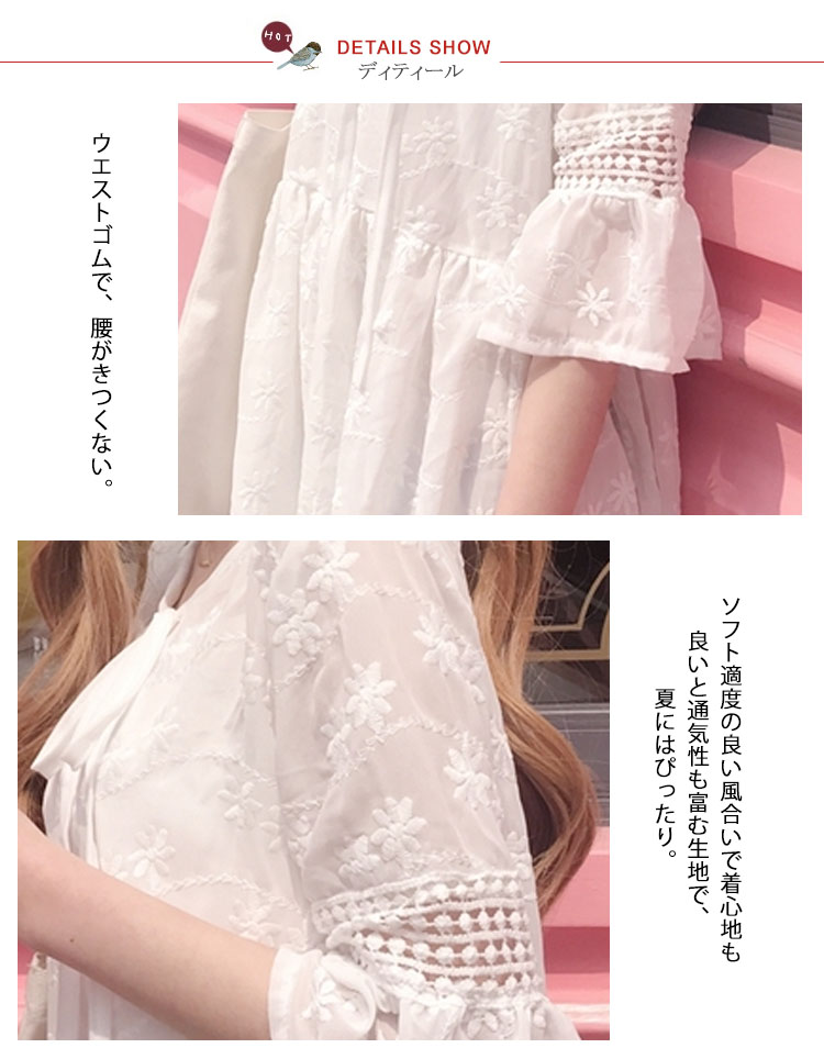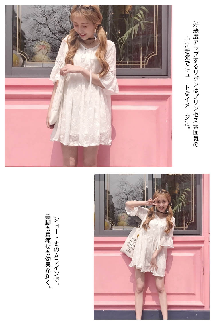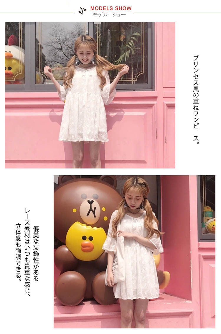 | プリンセス風の重ねワンピース。優美な装飾性があるレース素材はいつも貴重な感じ、立体感も強調できる。好感度アップするリボンはプリンセス雰囲気の中に活発でキュートなイメージに。ショート丈のAラインで、美脚も着痩せも効果が利く。夏に女性たちに絶対気に入るアイテム。 | |