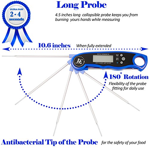 - ✅LONG FOLDING PROBE - Will help quickly and safely get the internal temperature of any cooked food - beef, chicken, pork, fish, lamb, or turkey. Also, digital meat thermometer works great with deep frying, making candy, baking, and beverages like beer, wine, milk, water etc.