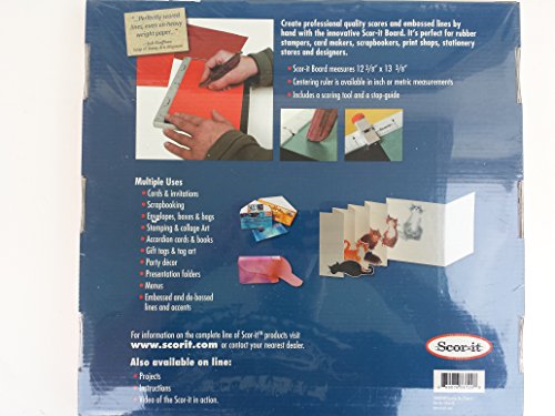 - Includes one board with a metric ruler, an attached scoring tool, a center scoring strip with a rubber pad on either side, a stop guide for easily keeping multiple pages lined up evenly, and instructions for use