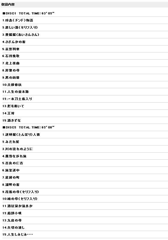 自身のヒット曲を含む昭和の名曲をずば抜けた歌唱力で歌い継ぐ、「珍島物語」「悲しい酒」「瞼の母」等、超厳選曲の贅沢なラインナップ2枚組。