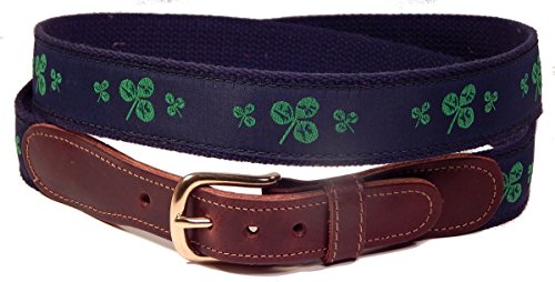 Product DescriptionRibbon has a repeating pattern of kelly green shamrocks on a navy background, sewn into a 1 1/4" wide navy web backing.0