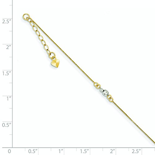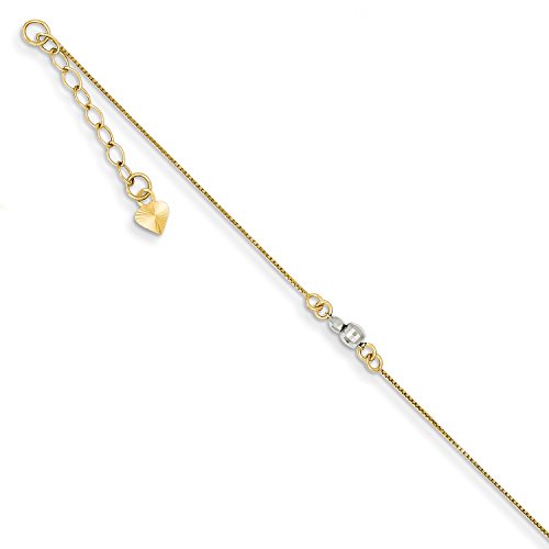 SPECIFICATIONS: Jewelry Type: Anklets, Chain Type: Ball (Beaded), Anklet Type: Anklets with Stations, Material: Primary: Gold, Material: Primary - Color: Two-Tone, Material: Primary - Purity: 14K, Finish: Polished, Chain Length: 9 in, Chain Width: 3mm, Clasp /Connector: Spring Ring, Feature(1): Adjustable, Texture: Diamond-cut