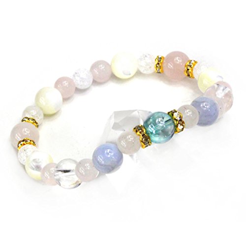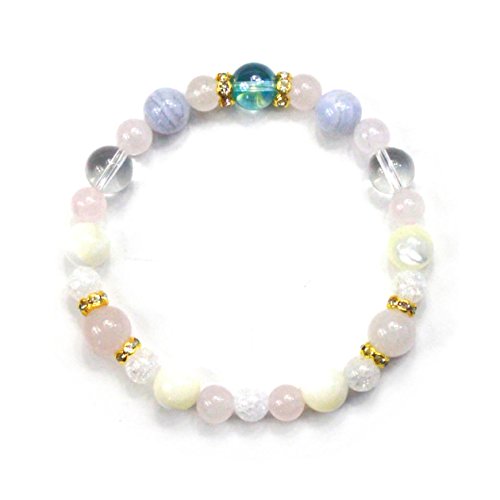 ◆사본다마와 같은 빛을 발하는 아쿠아 올라를 주요하석에 색취 훌륭한 천연석 파워 스톤에디자인된 콤비네이션 팔찌입니다. 블루나 핑크의 컬러풀한 색조와 크랙 쿼츠의 키라《메키》가 멋지게 융합한 패셔너블 파워 스톤 팔찌입니다.