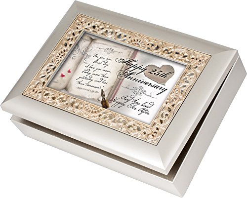 Studio : Cottage Garden Publisher : Cottage Garden Binding : Kitchen Product Description This beautiful jewelry music box has a elegant champagne silver finish with a classic rope trim. It plays a high quality Sankyo music mechanism that can be seen on the inside of the box through protective glass. It has a 4x6 photo frame lid so the picture can be exchange for a personal photo. The feet are cushioned so they don't scratch surfaces. The box has a 4x4x1.5 inch cavity for storing jewelry and keepsakes. The inside is lined in nice black velvet. The hinges prevent the lid from falling all the way back and getting damaged when opened. This makes a beautiful gift for any age. 0