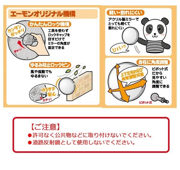 | 素材・材質 | ミラー:アクリル樹脂 フレーム:HIPS ピポット:ポリカーボネイト(ボルト部:ステンレス) ロックキャップ・ロックピン:ポリプロピレン クランク型金具・L型金具:スチール フランジナット・ボルト・タッピングビス:ステンレス スパナ:スチール(ニッケルメッキ) |