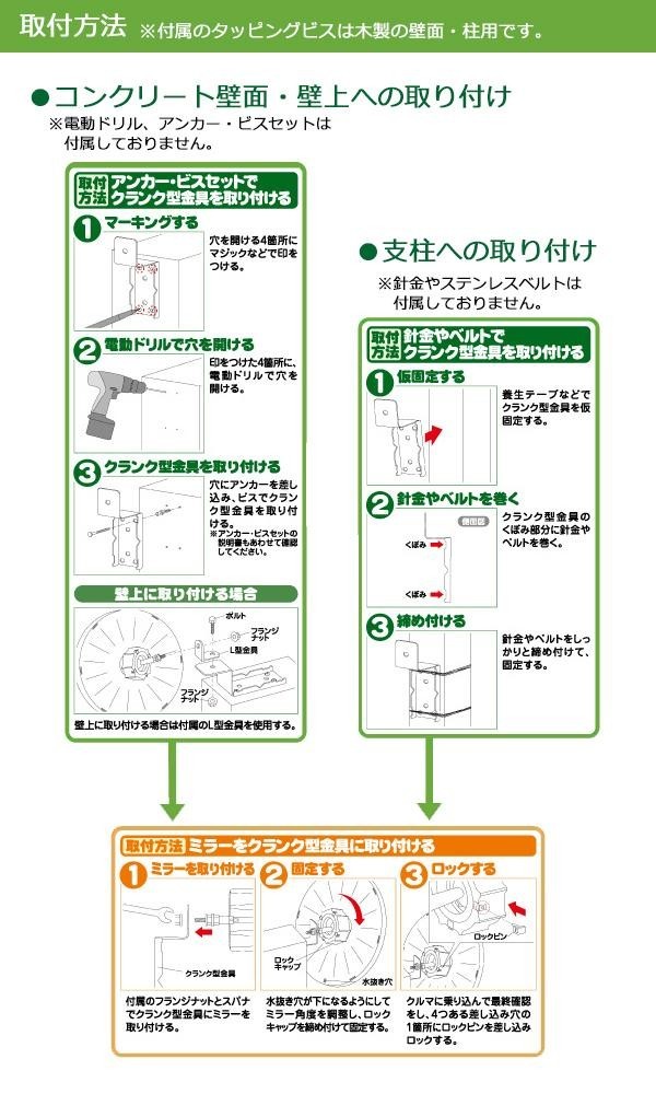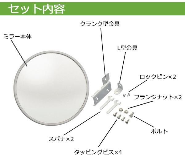 | セット内容 | ミラー本体:1個 L型金具:1個 クランク型金具:1個 ロックピン:2個 フランジナット:2個 ボルト:1個 タッピングビス:4本 スパナ:2本 |