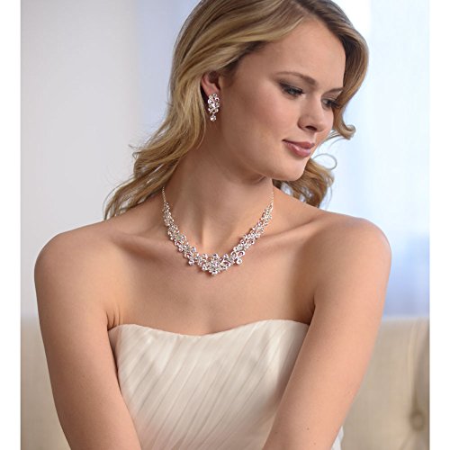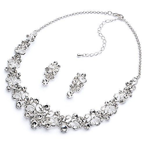 Rhinestone Jewelry Set is a stunning scrolling pattern with intricate detailing and accented with bold, glistening rhinestones. A breathtaking bridal jewelry set! This silver-plated necklace measures 15-17" long with the attached extender chain. The matching earrings measure 1" in length.Feature