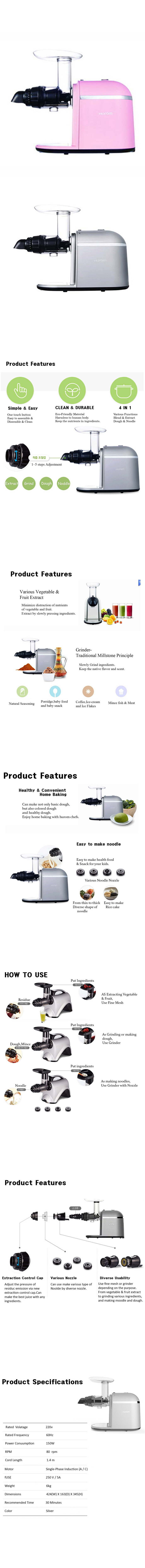 Includes 4 different nozzles for juicing,mincing,pasta,noodles,etc.