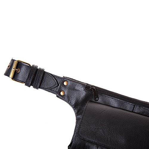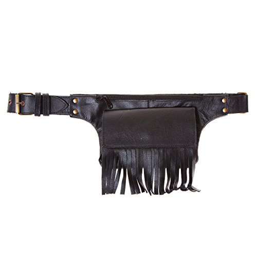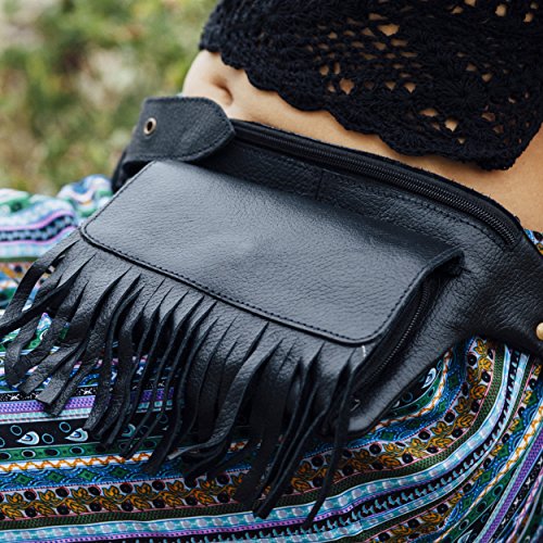 -. Title : Fringed Leather Hip Festival Travel fanny pack hip belt-Black-One size