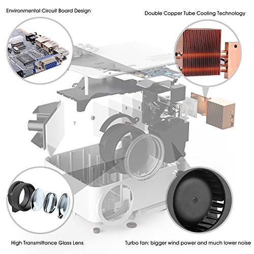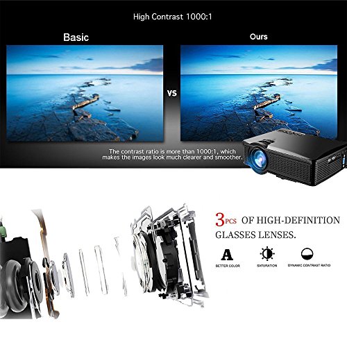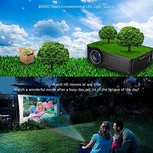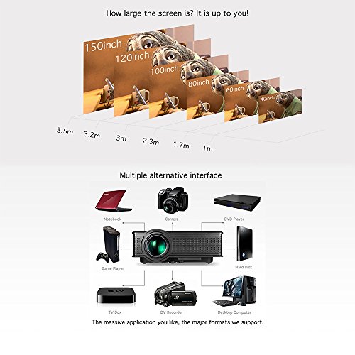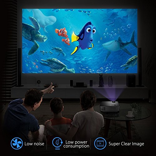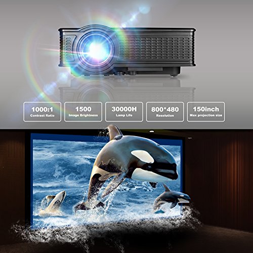 Superb vivid Picture 40-150 inches large projection size for you with better visual experience, brightness upgraded to 1500 lumens, more bright than other same conditions home projector, just like you are in a cinema