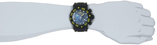 -. Feature : Swiss quartz movement / Flame-fusion crystal; brushed black ion-plated stainless steel case and bracelet with black polyurethane center links / Chronograph functions with 60 second, 30 minute and 1/10th of a second subdials; date function / Black textured dial with black, yellow and white hands, yellow hour markers; luminous; unidirectional black polyurethane bezel with yellow arabic numerals; screw-down crown and pushers; 2 interchangeable polyurethane straps and wetsuit strap included / Water resistant to 330 feet (100 M): suitable for snorkeling, as well as swimming, but not diving