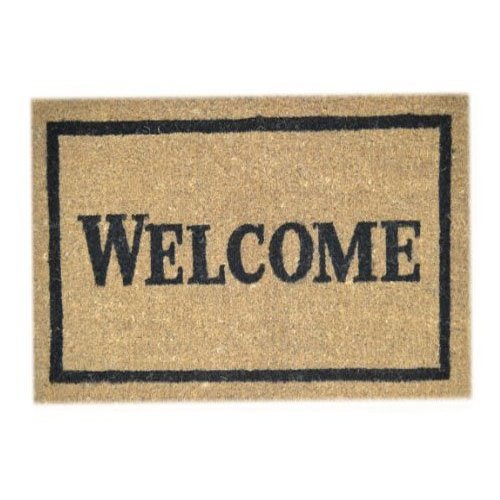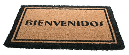 Add an international flair to your front door with this coir doormat painted with the word 'Bienvenidos' which means welcome in Spanish. A black border adds a finishing touch to the mat. Our coir doormats are handwoven from the best quality coir and painted with weather resistant colors. Coir is the natural fibre extracted from the husk of coconuts. Coir fibre is relatively waterproof, has superior scrubbing power and is resistant to the elements. With a coir doormat from Imports Decor, you can feel confident dirt and debris will be left at the front door and not in your home. Item #326BCMFeature