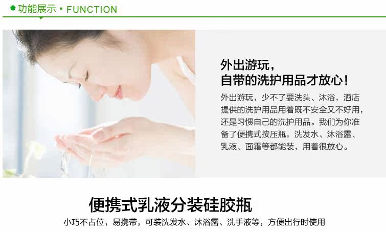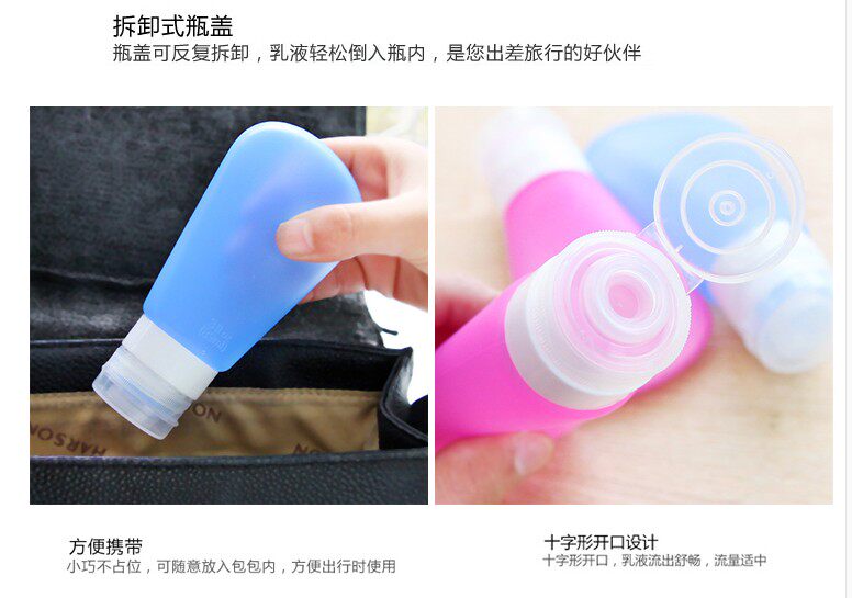 【用途】出门旅游,出差时会用到。把家里大瓶的洗发水、沐浴液、洗面奶用这个小瓶子分别分装起来,因为瓶子小,所以便于携带,小容量,而且可以过安检带上飞机无需托运.