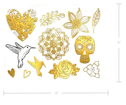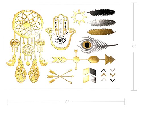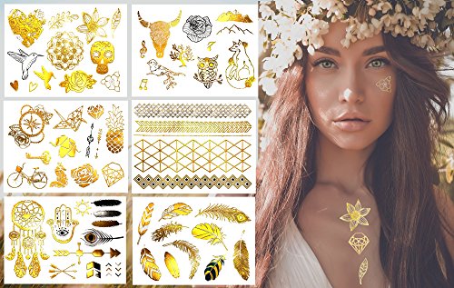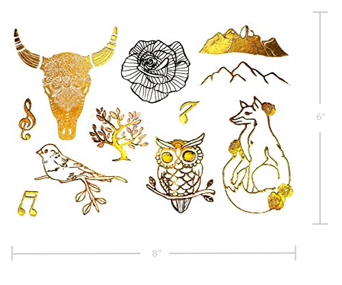 6 X sheets of the latest fake jewelry tattoos. Over 75+ vibrant foil tattoo designs in gold, silver and black. Designs include birds, roses, sugar skull, bull skull, owl, fox, feathers, dreamcatcher, arm/wrist bands and much more