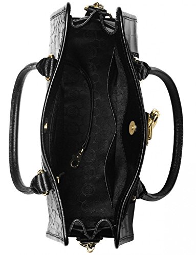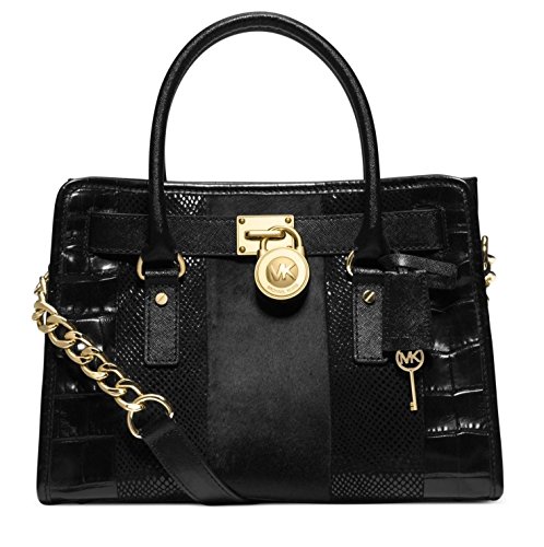 -. Brand : -. Department : womens -. Feature : Mixed leathers with calfhair stripe; gold-tone hardware / 12 3/4"W x 9"H x 5"D / Double top handles with 5" drop; long strap with 11" drop / Magnetic snap closure / Interior features zip, cellphone and multi-function pockets -. ProductGroup : Shoes -. ProductTypeName : HANDBAG -. Title : MICHAEL Hamilton Mixed Media E/W Satchel (Black)